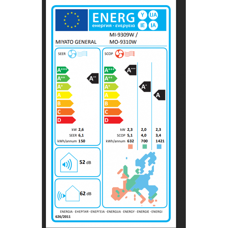 Συντελεστής ισχύος θέρμανσης (SCOP) : 5,1 (A+++) για ζεστή κλιματική ζώνη / 4,0 (Α+) για μέση κλιματική ζώνη
