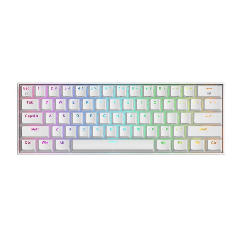 Gaming πληκτρολόγιο της εταιρείας Redragon με RGB φωτιζόμενα πλήκτρα σε γλώσσα αγγλικά US. Είναι μηχανικό, καθιστώντας το ιδανικό για gamers όπως επίσης και για όσους επιθυμούν γρήγορη πληκτρολόγηση. Έχει γρήγορη απόκριση και ακρίβεια, καθώς οι διακόπτες του ενεργοποιούνται στα μισά του πατήματος, εξοικονομώντας κινήσεις όταν πληκτρολογούμε. Σε σύγκριση με τα πληκτρολόγια μεμβράνης, αντέχουν περισσότερο στο χρόνο, έχουν όμως το μειονέκτημα του θορύβου που είναι πολλές φορές ενοχλητικό για τους γύρω. Διαθέτει Custom Brown διακόπτες, είναι σχετικά αθόρυβοι και πιο εργονομικοί από τους άλλους τύπους διακοπτών. Μια μέση λύση που συνδυάζει την γρηγοράδα του μπλε διακόπτη για αποδοτικότερη δακτυλογράφηση και την ακρίβεια του κόκκινου διακόπτη. Θεωρούνται κατάλληλοι για πληκτρολόγηση και για gaming, με εξαίρεση ίσως τα FPS. Έχει το 60% του μεγέθους ενός τυπικού keyboard, απαιτεί λιγότερο χώρο στο γραφείο και δεν διαθέτει αριθμητικά πλήκτρα στο δεξί μέρος του. Συνδέεται ασύρματα στον υπολογιστή για μεγαλύτερη άνεση κι ευελιξία.